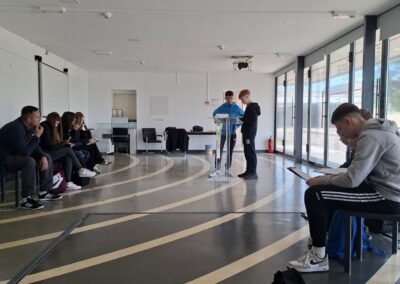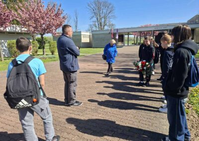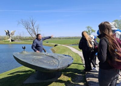 Nakon dvosatne vožnje, pred nama se ukazala široka travnata ledina sa Cvijetom u daljini. Kao što je spomenuto na satovima Povijesti, riječ je o jednom od najljepših postratnih spomenika na širem prostoru sa nemjerljivom simbolikom – kameni Cvijet izrasta iz mukom natopljene zemlje po kojoj su hodali i ubijani logoraši nekadašnjeg ustaškog koncentracijskog logora Jasenovac (1941.-1945.). U samom logoru stradalo je i petnaestak žitelja općine Jalžabet za koje smo položili cvijeće u kripti cvijeta. Posjet Jasenovcu započeo je susretom s muzejskim kustosom Đorđom koji je uz stazu prema spomeniku strpljivo govorio o nastanku logora, žrtvama, logorskom životu i dehumanizaciji zatočenih te o slavnom proboju 22. travnja 1945. Nakon obilaska Cvijeta, uslijedila je radionica uz memorijalni postav i pretraživanje imena, a pronašli smo i ime Dragutina Steinera, tridesetogodišnjeg Židova iz Kelemena kojeg su ustaše odveli 1942. i koji se iz logora nikad nije vratio. U skladu s pedagoškim preporukama, nakon potresne priče o logoru Jasenovac, uputili smo se na malo vedrije mjesto – u Hrvatsku Kostajnicu. Dočekao nas je prekrasni povijesni gradić okupan suncem, nabujalom rijekom Unom i Starim gradom Zrinski. Kostajnica je doživjela mnoge dobre trenutke poput ubrzane izgradnje u doba Napoleonove vlasti, ali i tragične kao za vrijeme Drugog svjetskog i Domovinskog rata.